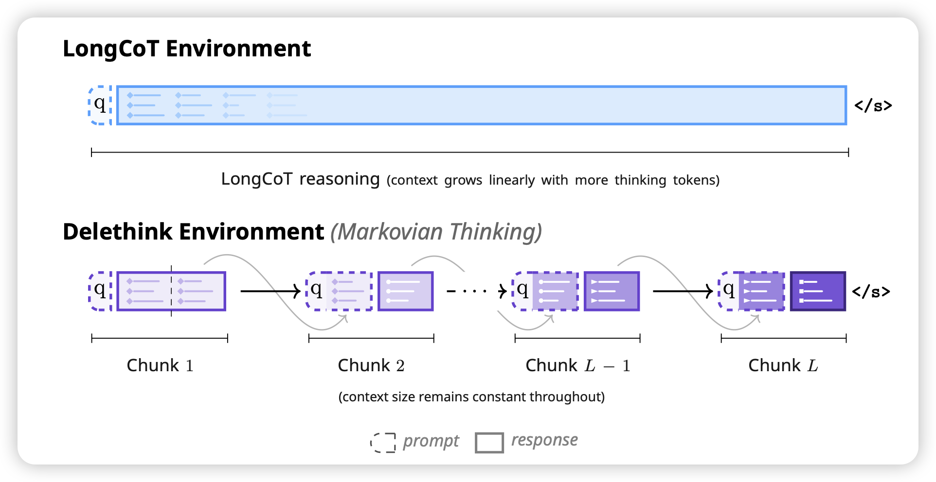 2025-10-09-insights 发表于 2025-10-11 更新于 2025-10-12 分类于 Arxiv-Insights 阅读次数: Valine: 本文字数: 221 阅读时长 ≈ 1 分钟 The Markovian Thinker 这篇工作名字很玄乎,其实做起来很简单:让正常的long-cot模型区分“chunk”(一些token)。每次到chunk结束时,把think清空,只保留前一个问题和前一个chunk结尾的一些token接着推理,这样context会永远不”爆“。但是直接这么应用,显然模型会表现很烂,所以作者做了rl 这个和之前google那个,parallel cot然后直接拼context的工作,是不是可以连在一起rl? 相关文章 本月更新(Recent Update) arxiv-insights 2025-10-13-insights 2025-10-10-insights 2025-10-08-insights
