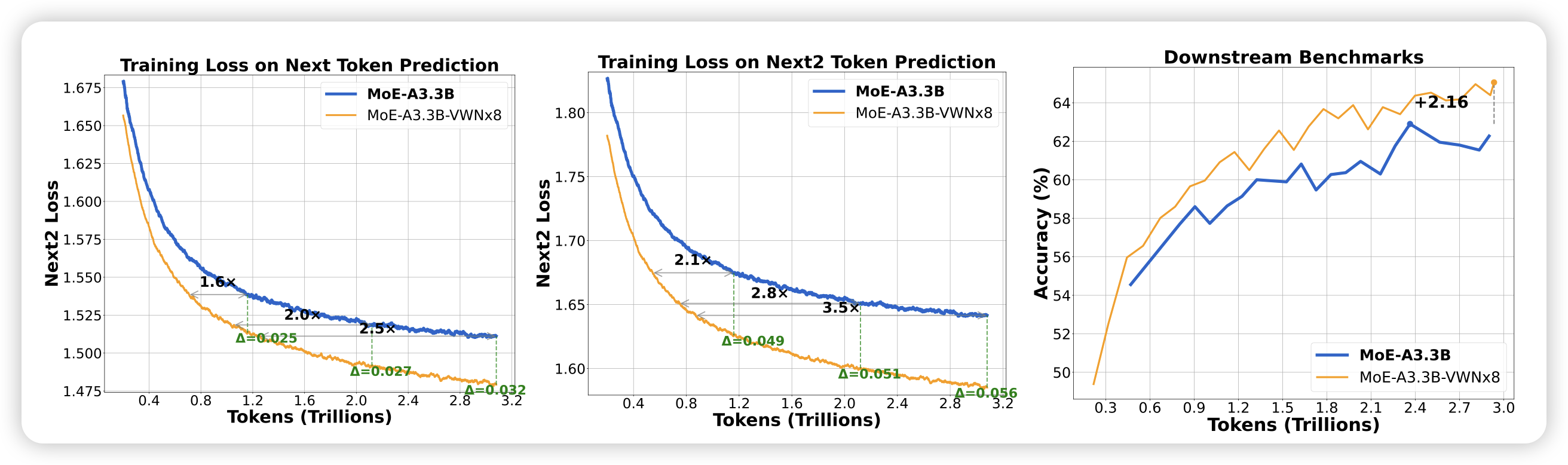 一篇模型结构的工作,作者讨论了一种叫做over-width的技巧。就是把word embedding的宽度搞得很大,然后在每个transformer block的入口投影成小维度,然后过一个比较窄的attention block,出来再投影到比较大,然后做残差链接。用这个方法,其实计算量增加不会很大的情况下,可以把模型参数量扩展到很大。